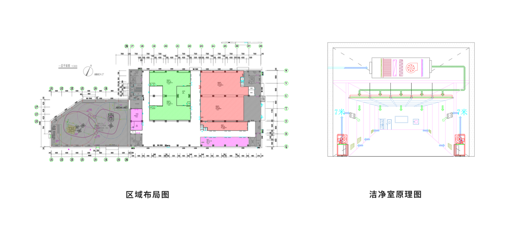 在层高较高的情况下满足万级洁净度,常规做法FFU静压不够,我们采取了一分为二的方式,上层5米非工作区采用空调箱+高效配合,下层7米工作区采用立式空调配合斜流风口,来满足洁净度要求。