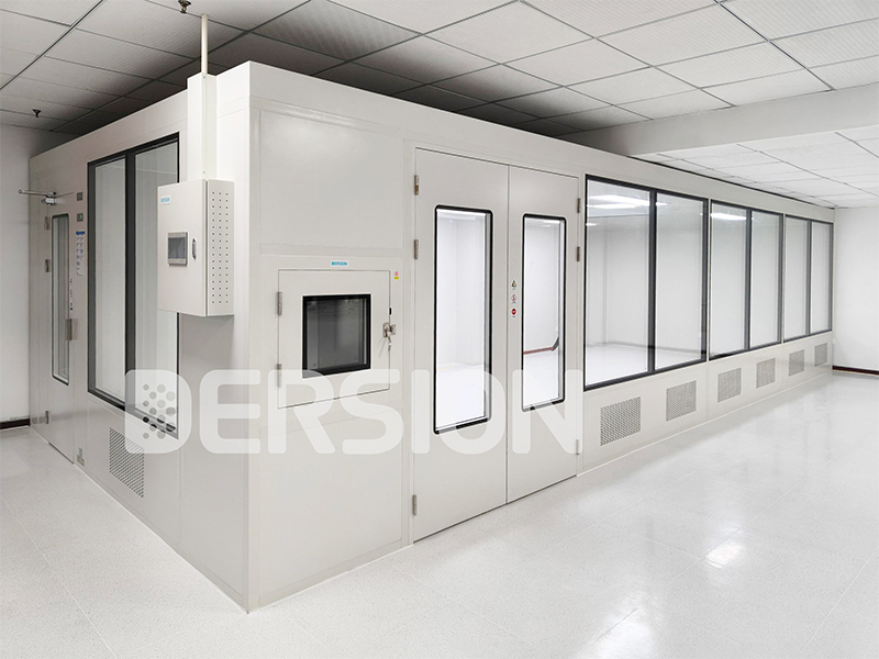本洁净室项目以模块化设计为核心,严格遵循万级洁净标准匠心打造。模块化洁净室主体结构采用手工岩棉板与双层中空玻璃组合,既保障了结构的稳固性与密闭性,又通过通透质感与简洁线条呈现高颜值外观;内部吊顶采用丝杆吊结构,安装高效且承重可靠,完美契合模块化快速搭建与后期调整的需求。气流组织采用顶送侧回设计,搭配 FFU(风机过滤单元)与高效过滤器的黄金组合,可快速过滤空气中的微粒杂质,确保洁净度持续达标。控制系统配备7寸液晶触摸屏,实现运行参数的实时监控与便捷调节;同时配套1台风淋室与1个普通传递窗,分别完成人员除尘与物料洁净传递,全方位阻断外界污染。